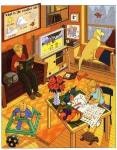 Find as many words as possible about this picture and reorder them in categories: animals/ people/ colours/ objects/ food/ weather. Then, we will make sentences.